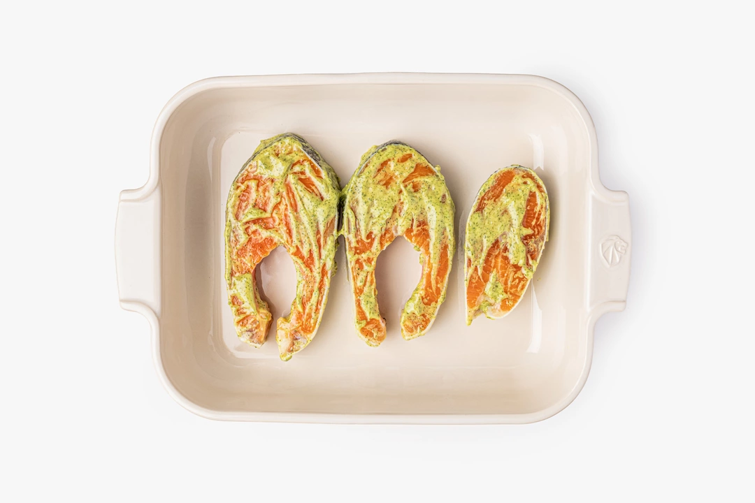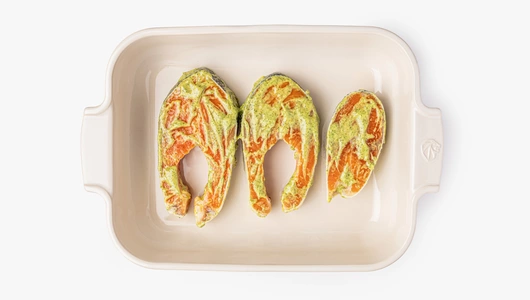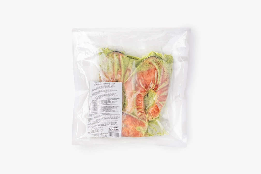 Деликатесная радужная форель, замаринованная в пряном сливочном соусе. Можно запечь прямо в упаковке, удалив лишь верхний пакет, — на это уйдёт всего 20–30 минут. Или приготовить на гриле — в компании дымного аромата богатый вкус рыбы раскроется особенно ярко. Советуем размораживать стейки на полке холодильника. Разморозка при комнатной температуре может плохо сказаться на текстуре нежной рыбы. Продукт аквакультуры. Рыба растёт в контролируемых условиях: живёт в экологически чистых акваториях и питается сбалансированным кормом без антибиотиков. Качество продукции проверяется и производителем, и в наших лабораториях. А вот природный оттенок красной рыбы — характеристика непостоянная. Его насыщенность зависит от места обитания, питания и даже времени года. Поэтому форель может быть ярче или бледнее, чем на фото.