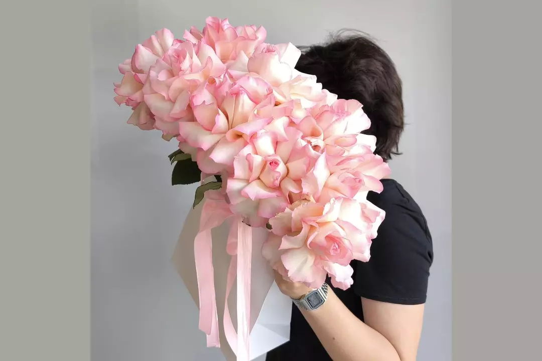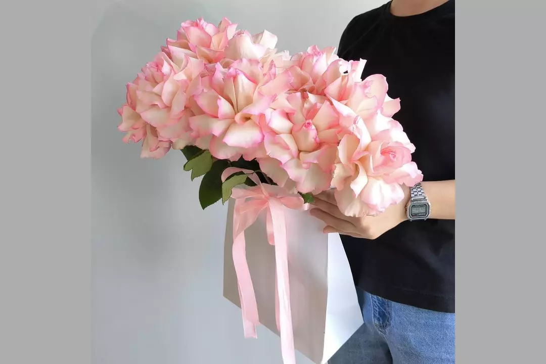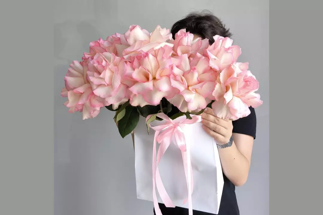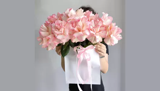 Состав букета: Роза - 9 шт Пакет белый - 1 шт. Лента атласная - 1 шт. Размеры: Ширина: 30 см Высота: 40 см