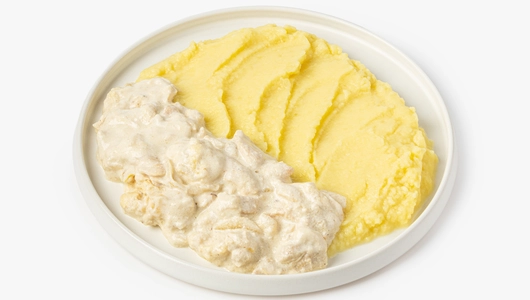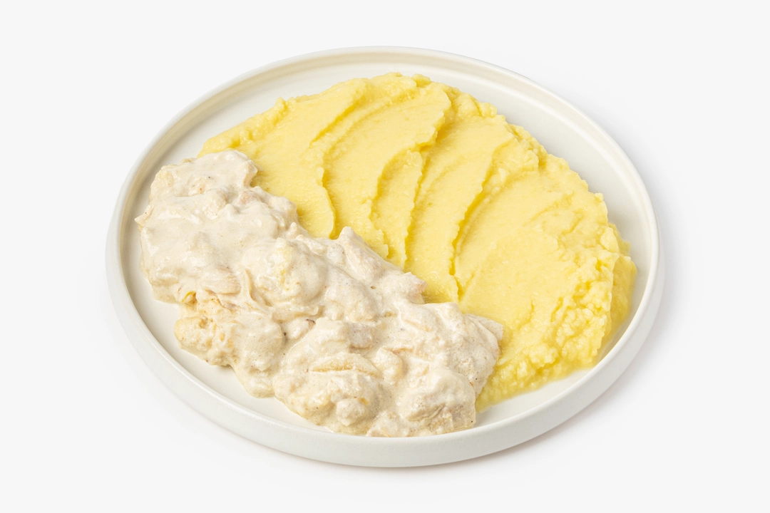 Нежное куриное филе в сливочном соусе с картофельным пюре — это готовое блюдо для сытного обеда или ужина. Кусочки грудки томятся в сливках с добавлением жареного лука и чеснока, которые придают соусу глубину и лёгкую сладость. Картофельное пюре на молоке получается мягким и бархатистым. Продукт уже приготовлен и бережно заморожен, вам нужно только разогреть блюдо и подать его на стол с овощным салатом и ломтиком свежего хлеба.
