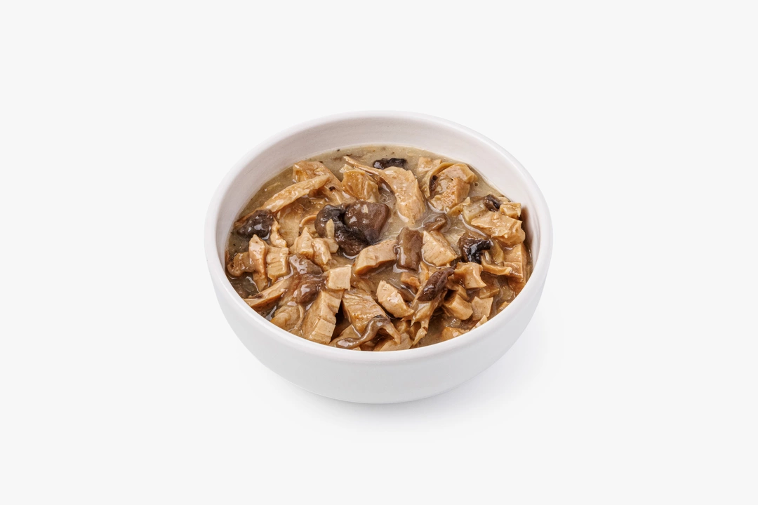 Сытное растительное рагу в соусе с нежной кремовой текстурой и грибным акцентом. Кусочки растительного белка в соусе со вкусом курицы сочетаются с шампиньонами и жареным луком. Соус обволакивает ингредиенты, делая вкус ровным и сбалансированным. Получается мягкое, насыщенное блюдо с домашним характером. Хорошо сочетается с рисом, пастой или картофельным пюре. Подходит для тех, кто придерживается растительного рациона.