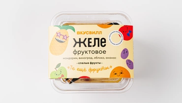 Натуральный фруктовый желейный десерт. Приготовлен из свежих спелых яблок и сочного ананаса, сладкого мандарина и терпкого винограда. Это полезное витаминное лакомство в удобной коробочке с вилкой легко захватить с собой на прогулку, в кино, на работу или на пикник.