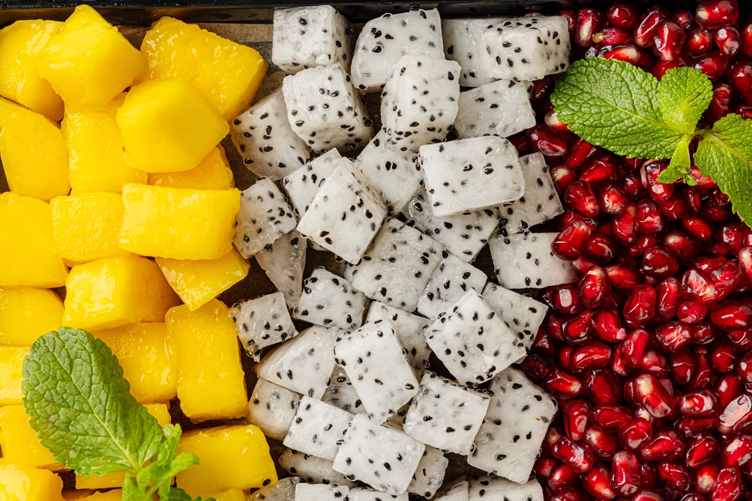 Королевское сочетание тропического манго, нежной питахайи и рубиновых зёрен граната. Этот элегантный микс станет изысканным украшением праздничного стола. Идеальный подарок для особого случая, который подчеркнёт ваше внимание к деталям.
