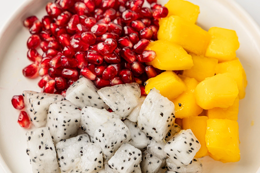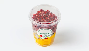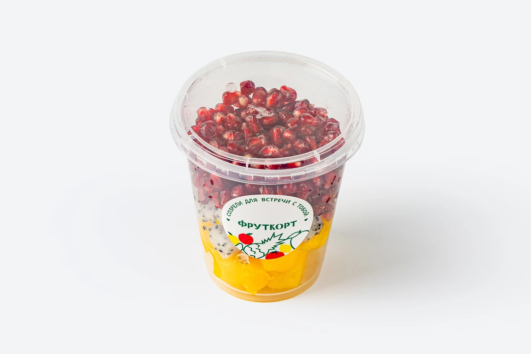 Спелое манго, нежная питахайя и рубиновые зерна граната в удобном стаканчике. Готовый полезный десерт, который можно взять с собой. Свежесть и польза в каждой порции!