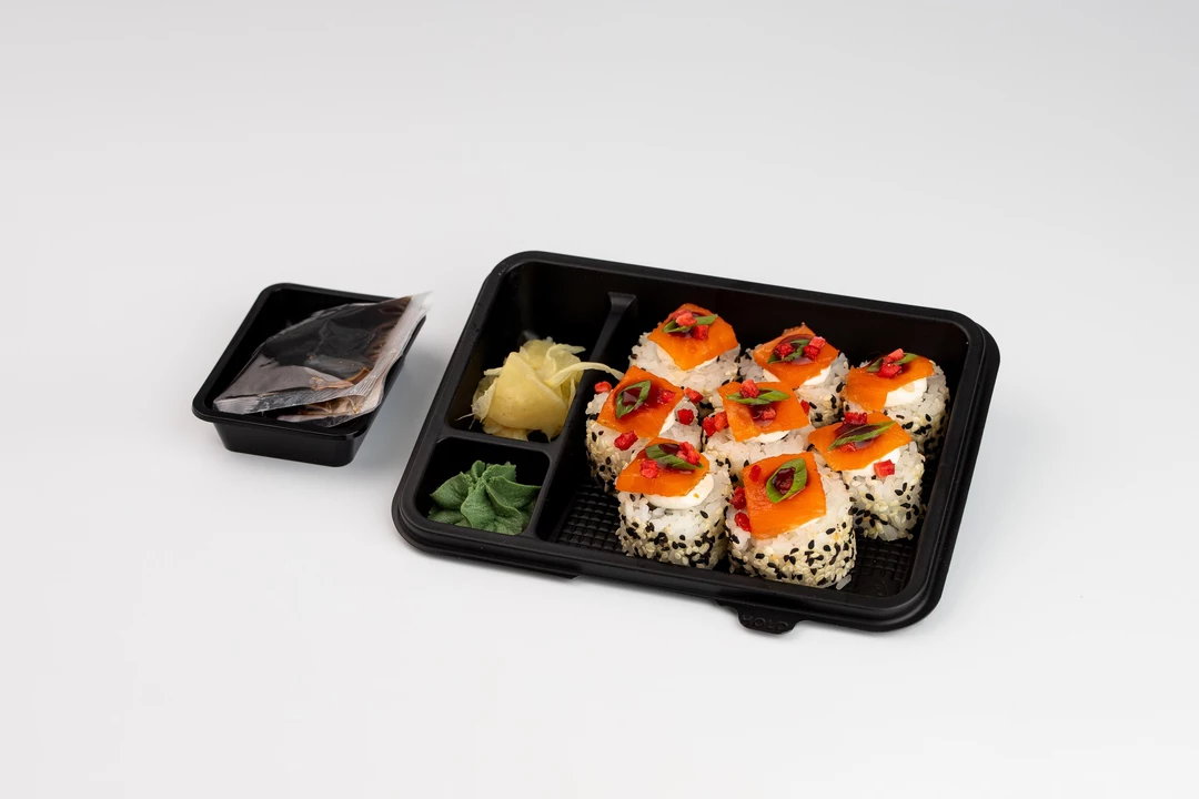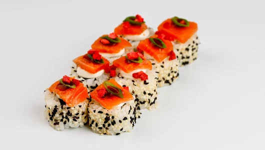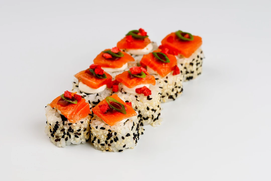 Этот ролл — воплощение гастрономического контраста и изысканности. В его основе лежит классический дуэт: отборный японский рис и хрустящий лист нори, скрывающие внутри нежный сливочный сыр и освежающую соломку огурца. Снаружи ролл щедро обвалян в мозаике из черного и белого кунжута, что придает ему приятную текстуру и легкий ореховый акцент. Главное украшение — пышная шапочка из творожного сыра, на которой расположились аккуратные ломтики слабосоленого лосося. Завершающий штрих превращает блюдо в шедевр: густой соус унаги дарит глубокую сладость, сублимированная клубника добавляет дерзкую ягодную кислинку и яркий аромат, а перья зеленого лука вносят финальную ноту свежести. Это смелое сочетание текстур и вкусов, которое удивляет с первого кусочка.