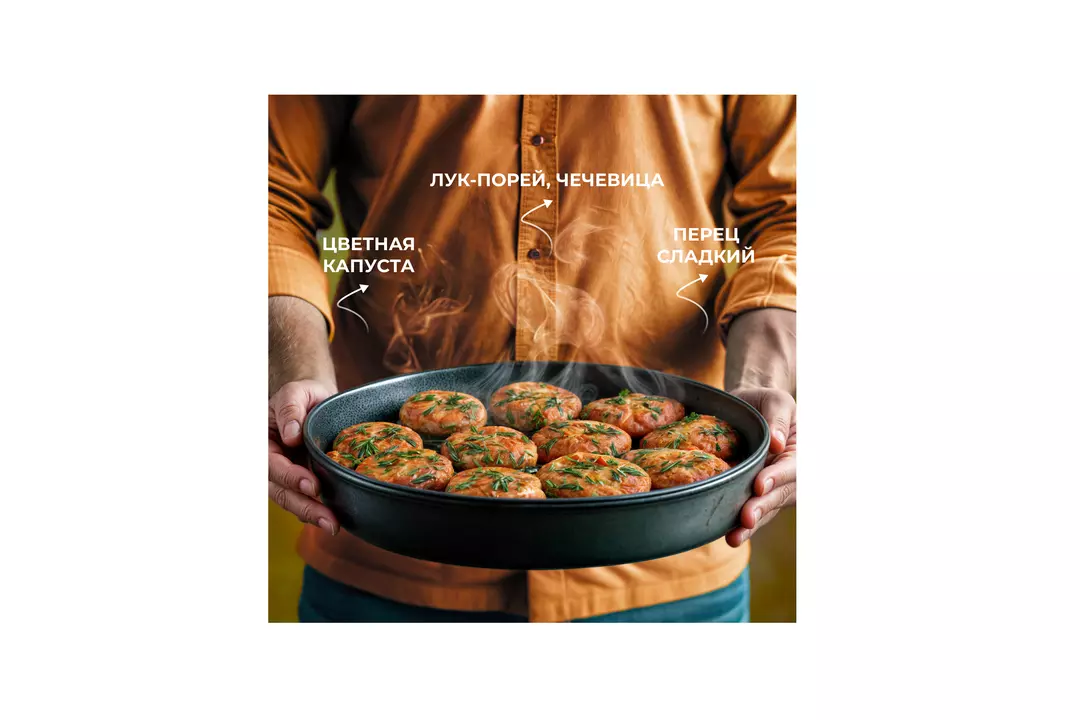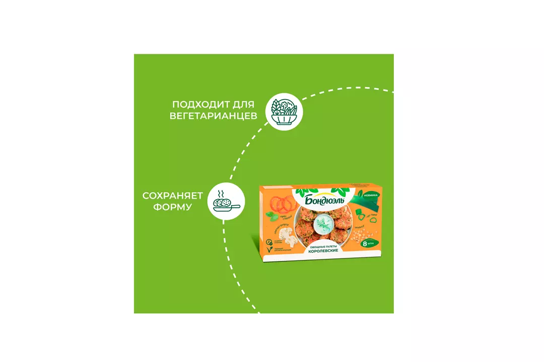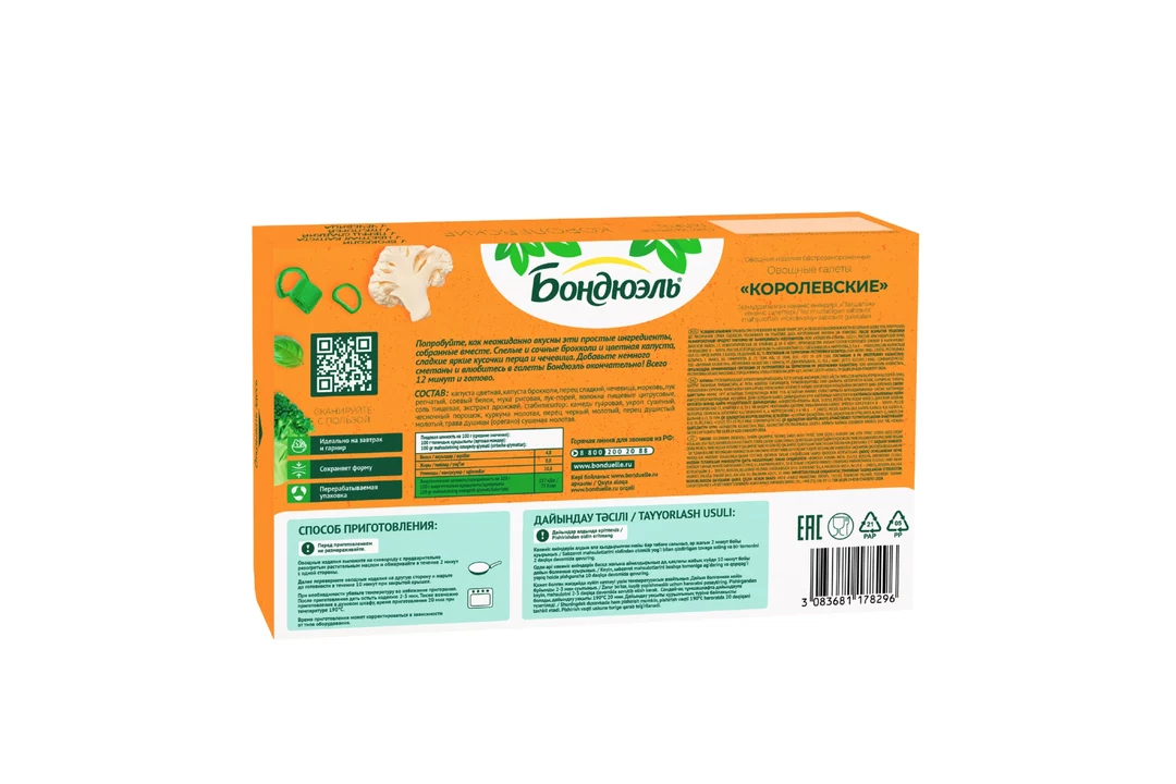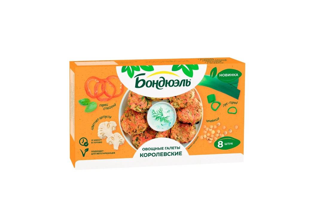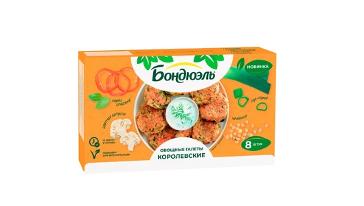 Галеты Бондюэль – это возможность легко ввести в меню овощи, богатые витаминами, минералами и клетчаткой. Микс цветной капусты, брокколи, сладкого перца, чечевицы, моркови и ароматных специй. Достаете из пачки не размораживая, обжариваете 7 минут на сковороде – и полезный ужин готов. Кстати, галеты можно есть и на завтрак, добавив их на тарелку к привычной яичнице. Страна производитель-Россия