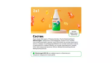 Детский гель для душа и шампунь 2 в 1 мягко и деликатно очищает кожу ребенка, поддерживая ее естественный pH баланс. Формула геля полностью безопасна для детей и не содержит SLES, SLS, парабенов, силиконов и минеральных масел. Не сушит и не раздражает нежную детскую кожу, не вызывает аллергии. Подходит для мытья головы. Яркая упаковка и вкусный аромат фруктового мармелада понравятся вашему ребенку и сделают купание веселым! В основе экологичного средства для детей - инновационный компонент Biomicrogel, который сделан из овощей и фруктов. Благодаря этому компоненту, средства WONDER LAB безопасны для человека, не вредят окружающей среде, не содержат токсичных компонентов и разлагаются на 98% за 1 день. Страна производитель-Россия