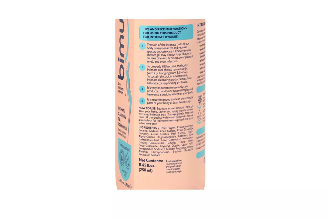 Обеспечивает деликатный и безопасный уход за чувствительной интимной зоной, дарит ощущение комфорта и свежести надолго. Сбалансированная формула на основе проверенных компонентов создана для поддержания женского интимного здоровья и местного иммунитета. Гель мягко очищает, не нарушая полезную микрофлору, предотвращает сухость и дискомфорт в интимной зоне и поддерживает оптимальный уровень полезных бактерий и pH. Средство усиливает естественную защиту интимной зоны и снижает риск возникновения инфекций. Гель обладает легким дезодорирующим свойством, а его мягкая формула подходит для ежедневного использования. Идеален при посещении бассейна, занятий спортом, до и после интимной близости. Может использоваться для мытья всего тела, особенно при повышенной чувствительности кожи. BIMUNICA™ содержит запатентованный комплекс натурального происхождения EOSIDIN™, который поддерживает защитную функцию кожи на естественной основе, устраняет покраснения и идеально подходит для чувствительной кожи. В состав входят природные компоненты: молочная кислота (для поддержания естественного pH микрофлоры (природного защитного барьера)), инулин (натуральный пребиотик, стимулирующий рост полезной микрофлоры), аллантоин (натуральное противомикробное вещество из корней лекарственного окопника), гидролат ромашки (успокаивает и восстанавливает, снимая покраснения и воспаления). В продукте отсутствуют: сульфаты, парабены, силиконы, красители, синтетические отдушки и минеральное масло. Способ применения: Выдавите небольшое количество геля на руку, вспеньте и аккуратно нанесите на влажные интимные участки тела. Бережно помассируйте. Тщательно смойте водой после применения. Важно! Проводить интимную гигиену нужно без использования мочалки и очищать только наружную часть влагалища.