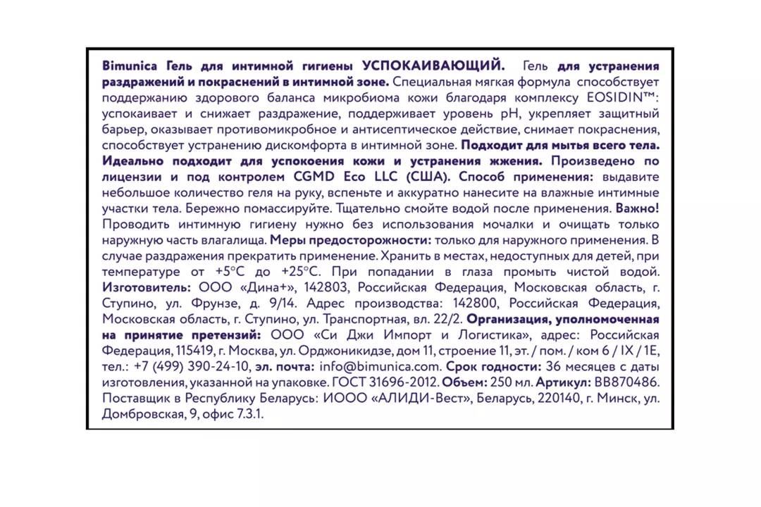 Гель для интимной гигиены Bimunica успокаивающий 250 мл / Супермаркет