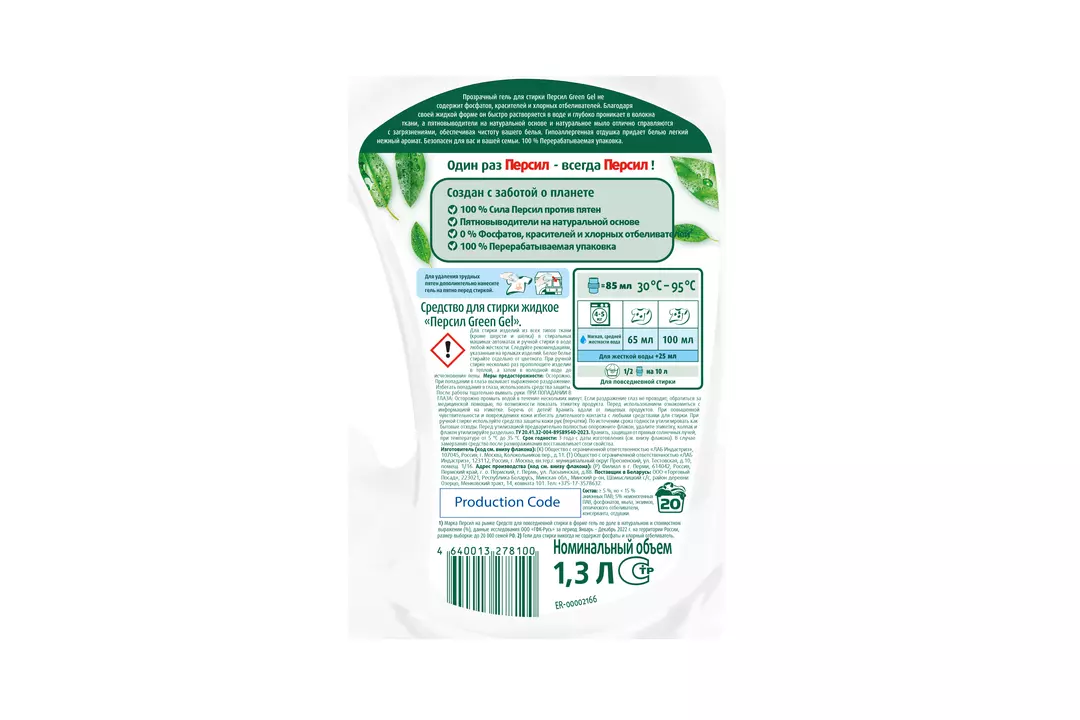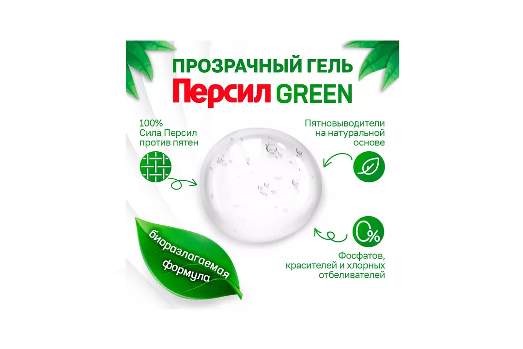 Жидкое средство бытовой химии, густой гель для стирки с пятновыводителем Персил Green: • хранится в 100 % перерабатываемой упаковке • содержит пятновыводители на натуральной основе • гипоаллергенная отдушка • не содержит фосфатов, красителей и хлорного отбеливателя • справляется со сложными загрязнениями • подходит для стирки изделий из всех типов ткани, кроме шерсти и шёлка • Растворяется даже в холодной воде и при стирке на коротких циклах • не оставляет разводов и полностью • защищает вашу стиральную машину от образования известкового налёта для жёсткой и мягкой воды выполаскивается водой. Производитель ООО ЛАБ Индастриз. Страна производитель-Россия