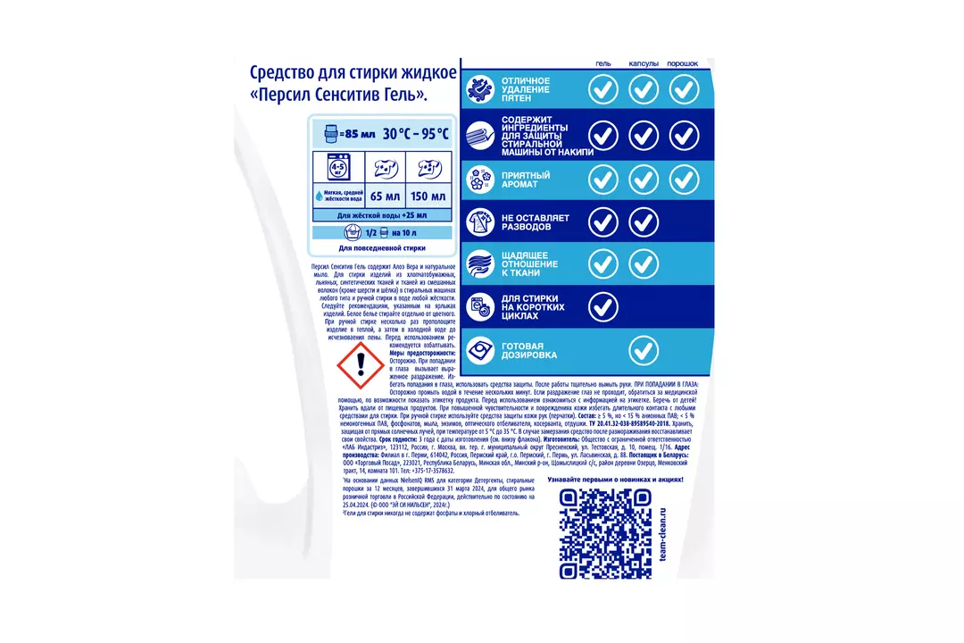 Гель для стирки Персил Сенситив — деликатность, которой можно доверять. Это идеальное решение для бережного ухода за одеждой и заботы о коже. Разработан специально для людей с чувствительной кожей, он содержит ингредиенты на натуральной основе, обеспечивающие бережную и эффективную стирку. Этот жидкий стиральный порошок подходит для всех типов ткани, кроме шелка и шерсти, и одинаково хорошо справляется с цветным и светлым бельем. Сохраняет яркость тканей, удаляет загрязнения и дарит чистоту и свежесть каждому изделию. Подходит как для ручной, так и для машинной стирки, не оставляя следов и обеспечивая безупречный результат. С Персил Сенситив ваша одежда будет выглядеть как новая, а кожа — чувствовать себя комфортно. Объем 2,6 литра рассчитан на 40 стирок, что делает этот гель экономичным выбором для всей семьи. Производитель ООО ЛАБ Индастриз. Россия