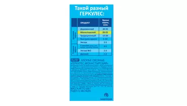 Тип: хлопья из цельного зерна минимальной степени плющения (20%). Время варки: 20 мин. Консистенция готового продукта: плотная, густая каша из овсяных хлопьев. Сколько хорошего может поместиться в одной ложке каши? Оказывается, довольно много. Овсяные зерна для ГЕРКУЛЕС Монастырский обрабатываются при помощи современных деликатных технологий, которые гарантируют, что овсяные хлопья получаются тонкими и нежными и в них сохранится польза цельного зерна. Страна-производитель Россия