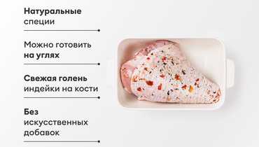 Голень индейки в натуральном маринаде из трёх простых специй. Только свежее мясо без консервантов и усилителей вкуса. Проверили на содержание 23 видов антибиотиков