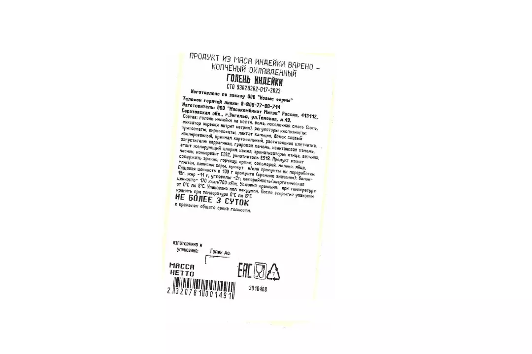 Голень Инди Лайт индейки варено-копченая охлажденная весовая ~ 0,5 кг / Супермаркет
