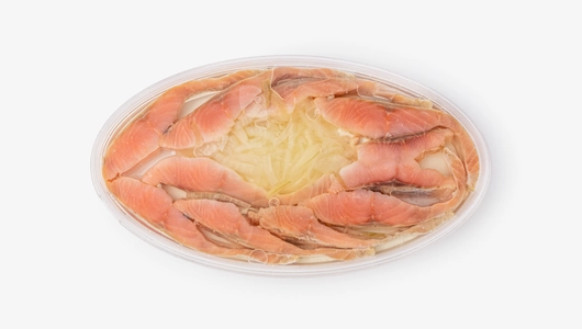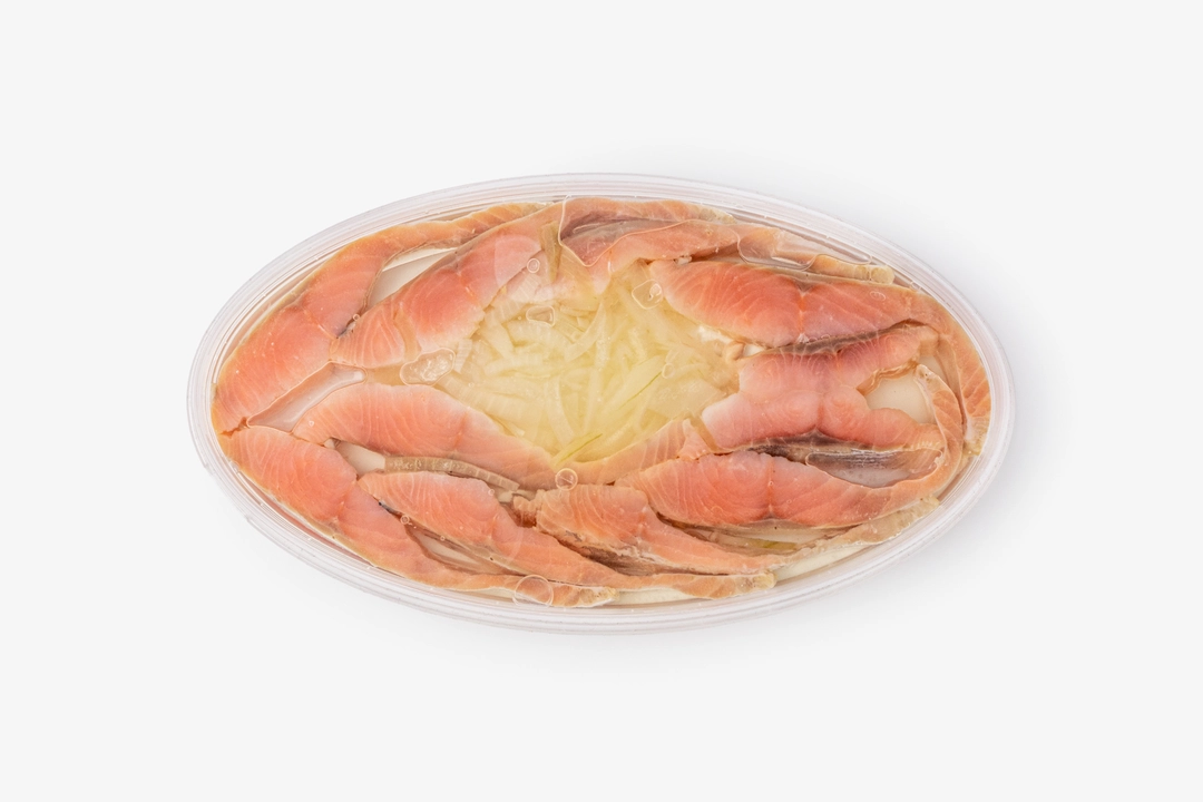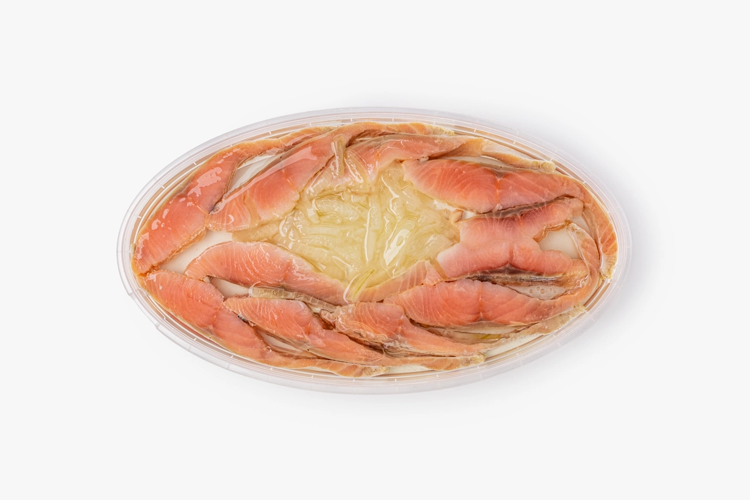Филе горбуши в заливке из подсолнечного масла с маринованным репчатым лучком. Ломтики нежные, в меру солёные, примерно одного размера. Мы зачищаем филе без применения химических веществ, поэтому в рыбе могут оставаться мелкие косточки. С такими кусочками удобно готовить бутерброды и всевозможные закуски. А для сытного обеда к рыбе можно отварить молодой картофель. Масса основного продукта 120 г.