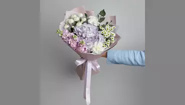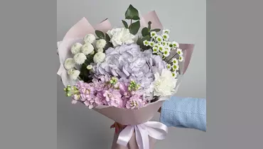 Нежный букет с воздушной гортензией и ароматной маттиолой подарит прекрасное настроение Вашей любимой девушке, жене или маме. Не забудьте подрезать цветы перед тем как ставить в вазу (после подрезки в течении 2-3 секунд поставьте в воду). Не храните букет на прямых солнечных лучах и возле отопительных приборов, чтобы сохранить цветы свежими как можно дольше . К каждому нашему букету мы приложим открытку с вашими пожеланиями, инструкцию по уходу за букетом и специальную подкормку для цветов. Состав: Гортензия-1 шт Эвкалипт пучок-1 шт Гвоздика-2 шт Маттиола-1 шт Сантини мадиба-1 шт Сантини кокосик-1 шт