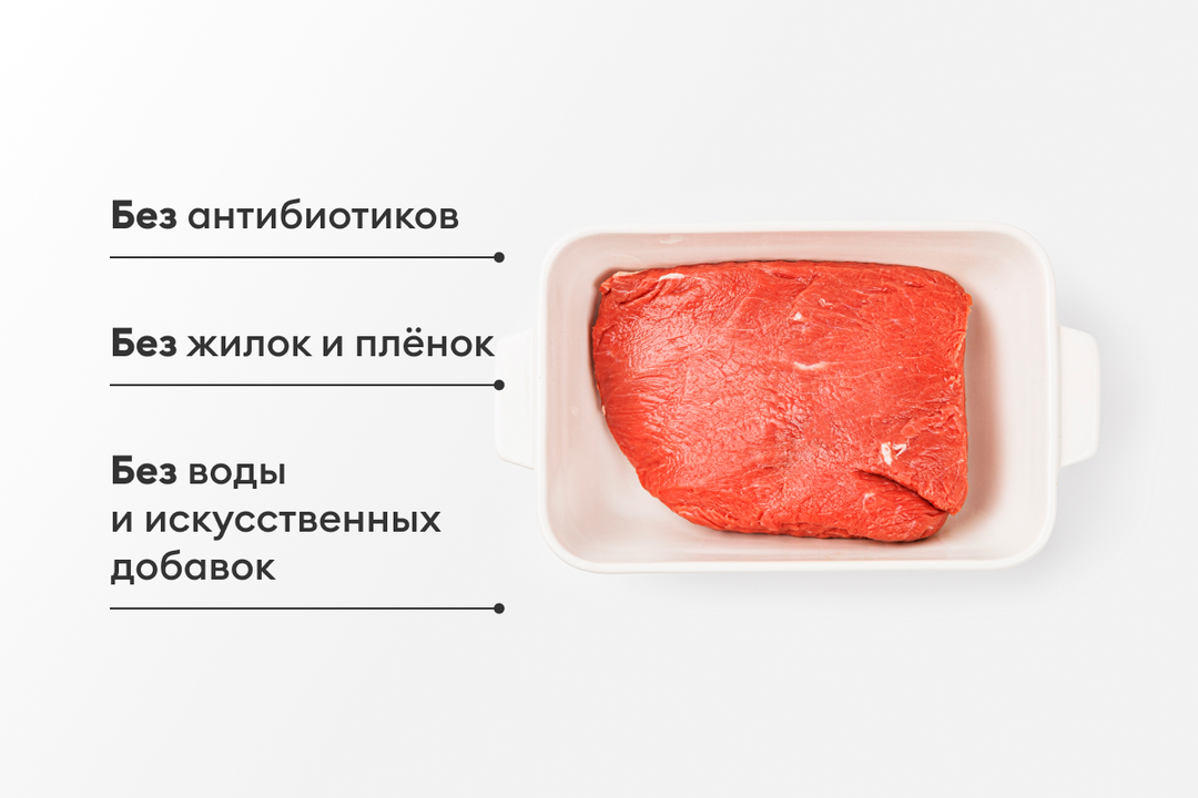 Нежная и сочная мякоть говядины. Нарезается из тазобедренного отруба. Мы вручную зачистили мясо от жилок, удалили плёнки и излишки жира — чтобы ничего не отвлекало от приготовления аппетитных блюд. Яркая по вкусу говядина отлично подойдёт для повседневного и праздничного меню. Советуем запекать в фольге или рукаве не менее 1,5 часов при 165ºС. Упаковка содержит газовую среду, которая включает в себя кислород. Кислород насыщает мясо, из-за чего его верхний слой красный, а срез намного темнее.