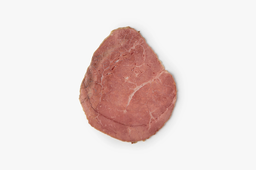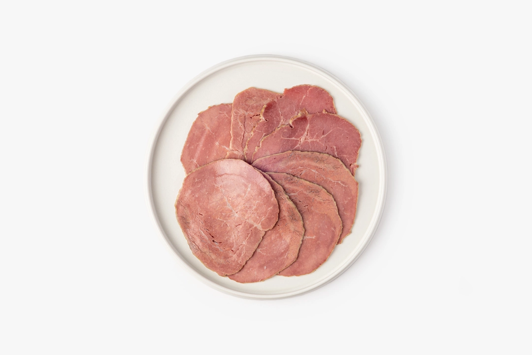 Нежное отварное мясо с выраженным говяжьим вкусом и мягкой, ровной текстурой. Тонкие ломтики подходят как для холодной подачи в составе мясной тарелки, так и для добавления в салаты или сэндвичи. Вкус спокойный, без выраженных пряных акцентов — говядина остаётся в центре внимания. Такой вариант удобен, когда нужен универсальный мясной продукт без лишних вкусовых добавок.