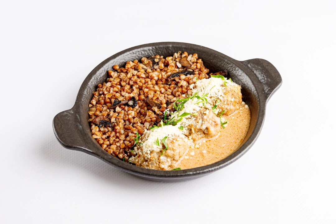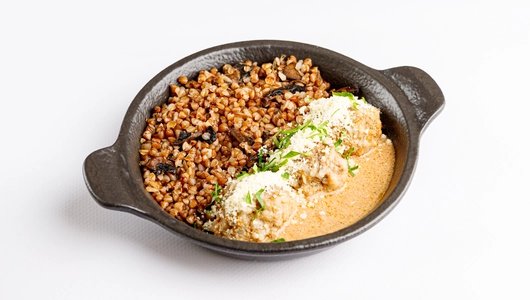 Ароматные мясные тефтели из говядины с рисом, репчатым луком и душистым чесноком, запеченные до готовности в собственном соку и сдобренные томатно-сметанным соусом, с гарниром из гречневой каши с жареными шампиньонами и луком.