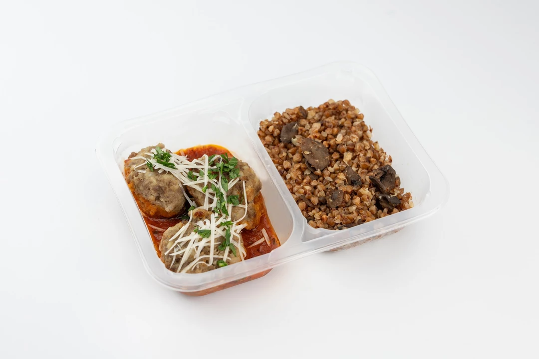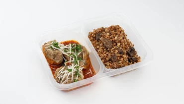 Говяжьи тефтели в томатном соусе с гречкой и грибами