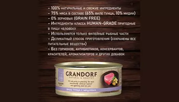 GRANDORF Корм влаж.филе тунца с мидиями д/кошек конс.70г купить с бесплатной доставкой на дом всего за 2 часа из ВкусВилла. Также можно оформить онлайн-заявку на самовывоз и забрать собранный заказ через 30 минут. Цены, отзывы о товарах от наших покупателей, действующие акции на официальном сайте ВкусВилл.