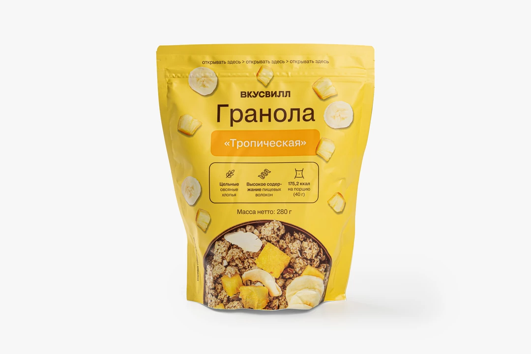Мультиполезная смесь для здорового, питательного завтрака. Основа гранолы — цельнозерновые хлопья из овса и пшеницы. Для сладкой пряности добавлен натуральный мед, корица и карамелизированный сахар. Кусочки ананаса, кокоса и банановые чипсы делают гранолу аппетитно тропической и еще более сытной. Гранола уже готова к употреблению. Остается добавить в нее молоко, йогурт или ряженку и начать день с настоящего лакомства.