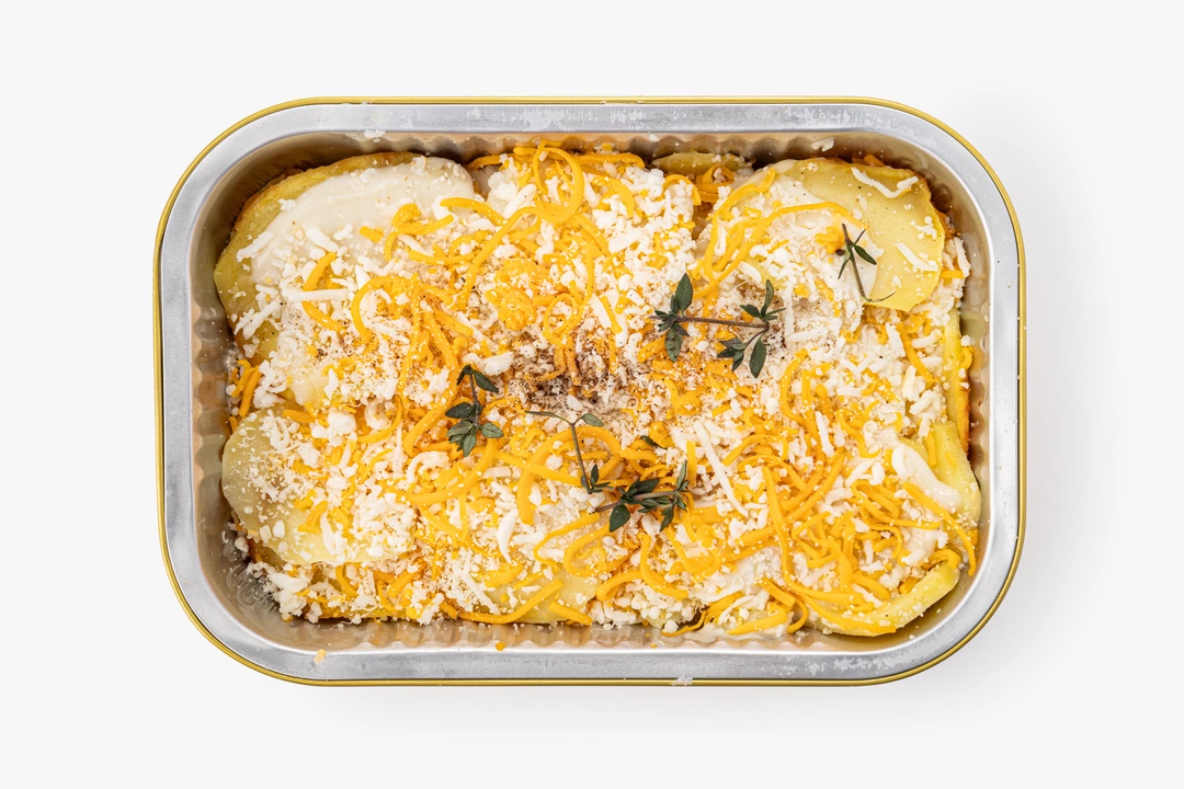 Аппетитный картофельный гратен — это уютное блюдо для семейного вечера. Его изюминка — три сорта сыра, каждый со своим характером: нежная сливочная моцарелла, пикантный пармезан и лёгкий чеддер с ореховыми нотами. Мы уже запекли картофель с чесноком и приготовили бешамель с мускатным орехом. Вам остаётся только доготовить продукт в духовке или микроволновой печи, чтобы сырная корочка растеклась по поверхности и зарумянилась. С этим набором вы легко создадите атмосферу французского бистро у себя дома.