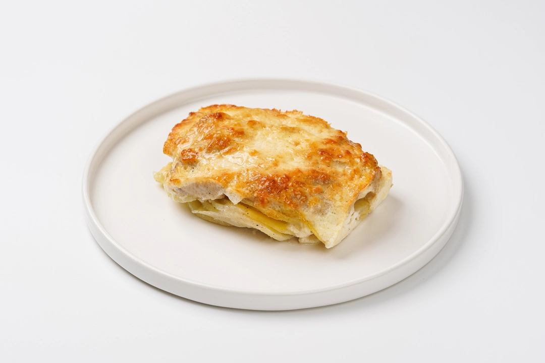 Тонко нарезанный картофель и куриная грудка запекаются в сливочном соусе на основе пармезана, сливок и чесночного масла, который пропитывает каждый слой. Моцарелла сверху образует золотистую тягучую корочку, а чёрный перец добавляет лёгкую пикантность. Блюдо полностью готово — остаётся лишь разогреть его, чтобы сыр расплавился, а соус снова стал нежным. Хорошо сочетается с овощным салатом или ломтиком хлеба. Удобный формат подойдёт для ужина, когда хочется чего-то простого, но в то же время аппетитного и питательного.