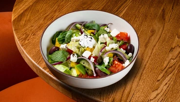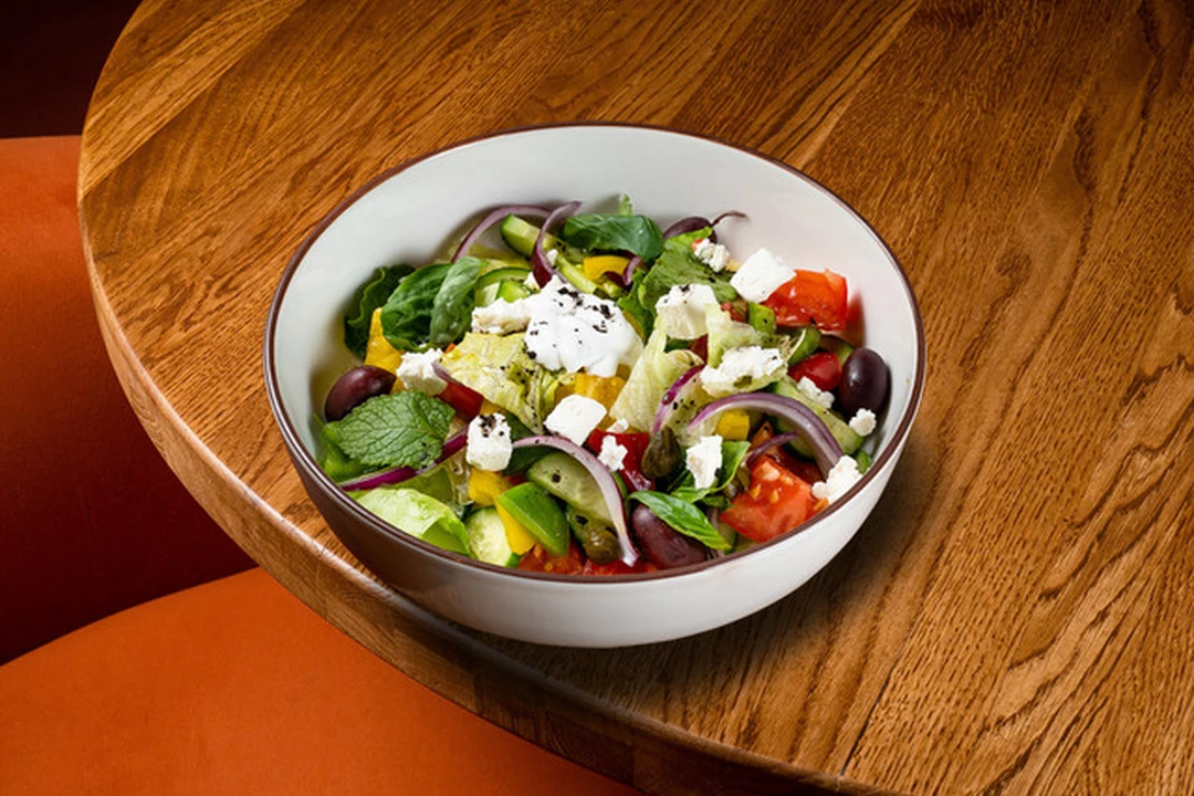 Свежее прочтение любимого салата: cпелые томаты, сладкий перец, свежий огурец, красный лук, пикантные оливки с каперсами и листья салатов с мятой в сопровождении феты и мягкого козьего сыра