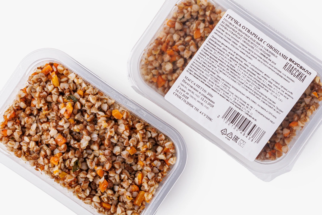 Рассыпчатая гречка по-домашнему с обжаренным луком и овощами. Блюдо можно подавать как самостоятельный лёгкий обед, так и в качестве гарнира к мясу или рыбе. Перед употреблением рекомендуем разогреть в микроволновой печи в течение 1–2 минут.