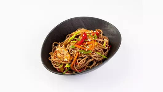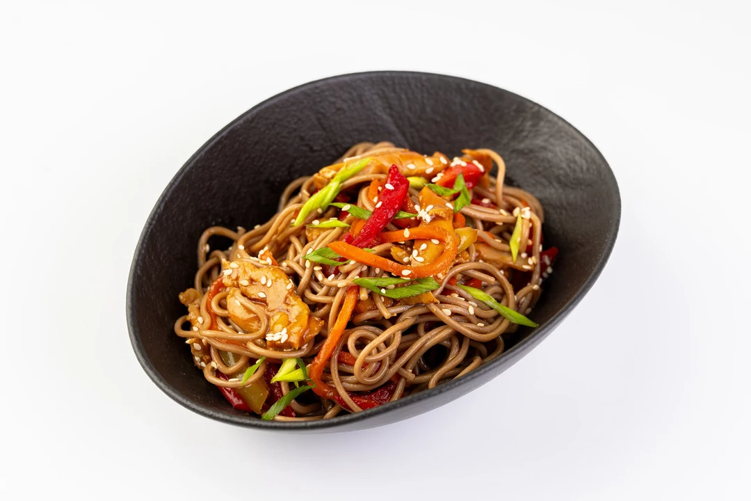 Сытное блюдо из темной гречневой лапши и кусочков куриного филе. Овощной микс из сладкого перца и моркови вместе с традиционным соусом Терияки создают сбалансированный вкус. Соус мягко обволакивает лапшу, делая её ароматной и нежной. Посыпается кунжутом и свежим луком.
