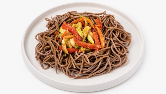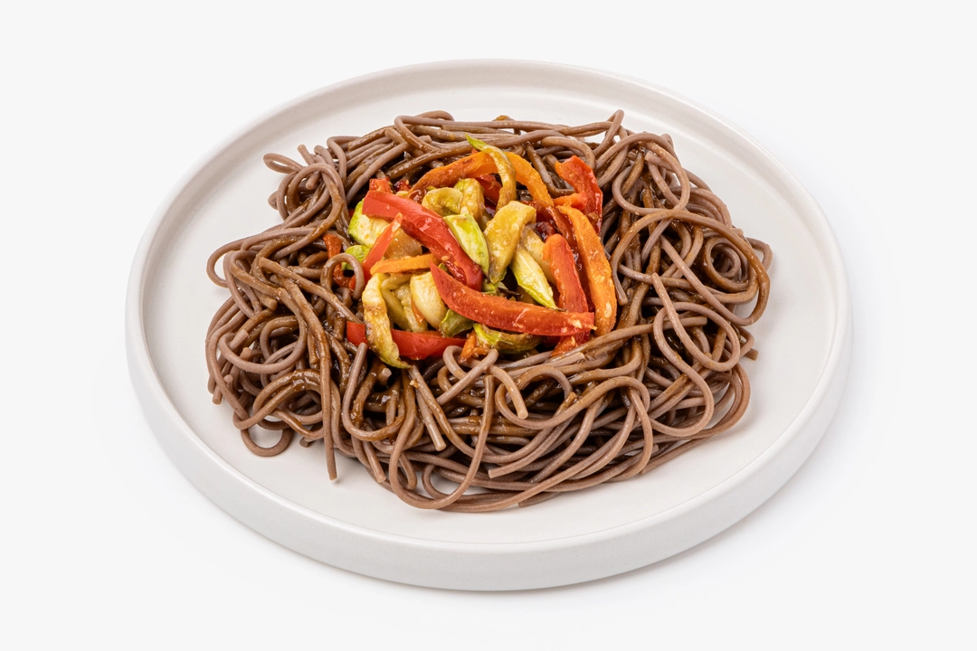 Гречневая соба с овощами, заправленная пряным соусом «терияки». Это блюдо в азиатском стиле особенно оценят те, кто не любит острое. Прекрасный выбор для лёгкого обеда или плотного перекуса.