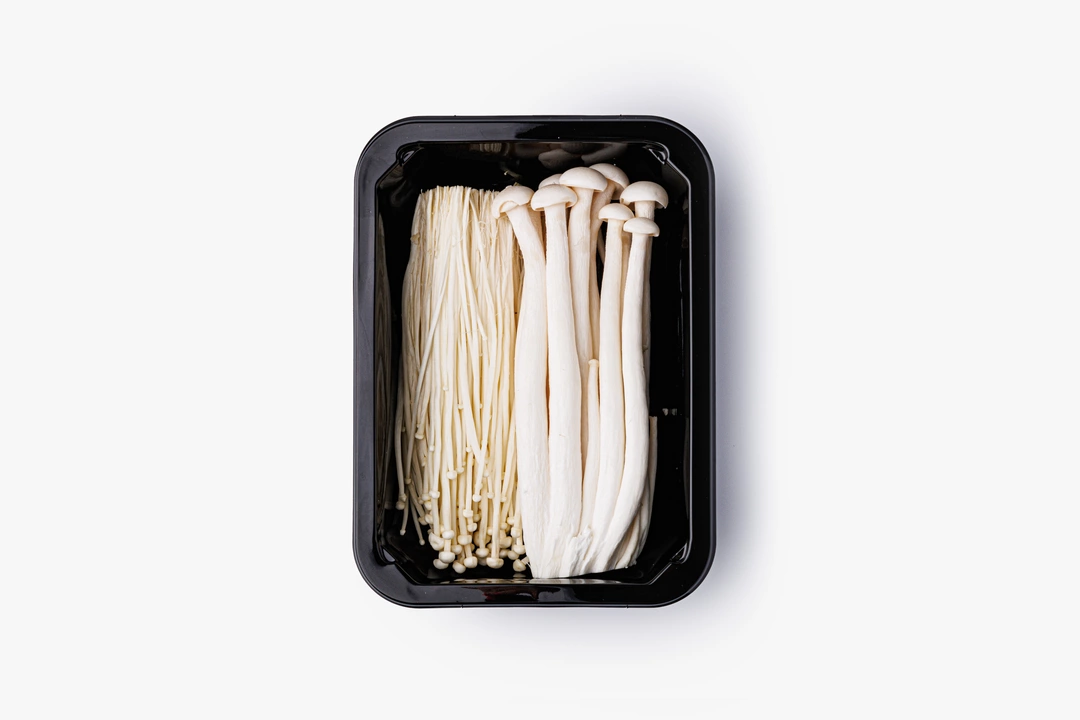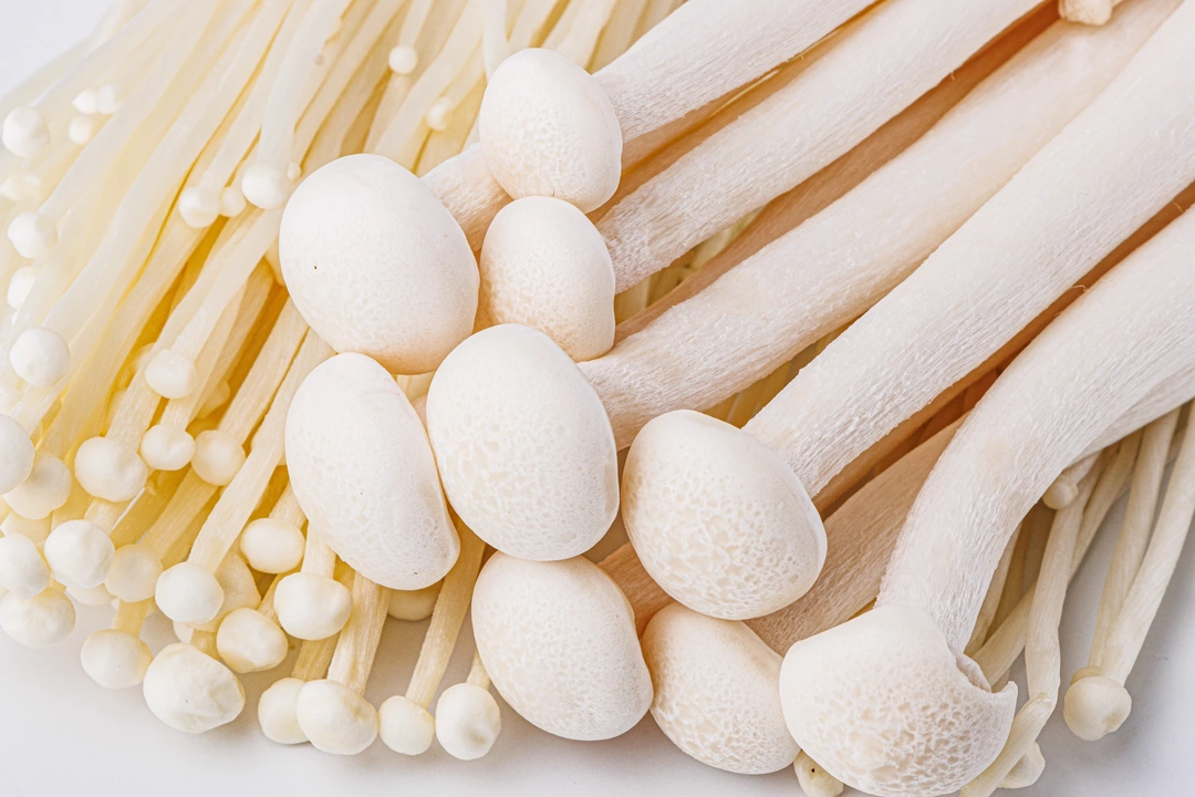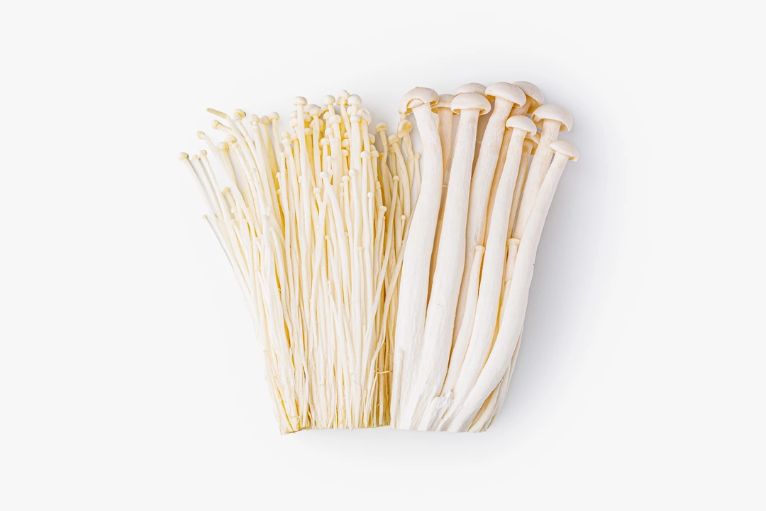 Эноки и шимеджи — два вида азиатских грибов с разным характером, но похожим мягким вкусом. Эноки — тонкие белые грибочки с длинными ножками и небольшими шляпками, они слегка хрустят и добавляют блюду нежности. Шимеджи более плотные и ароматные, с лёгкой ореховой нотой. Вместе они хорошо сочетаются в супах, овощных и мясных рагу, лапше или жарком в воке. Можно добавлять их и в салаты, предварительно быстро обжарив.