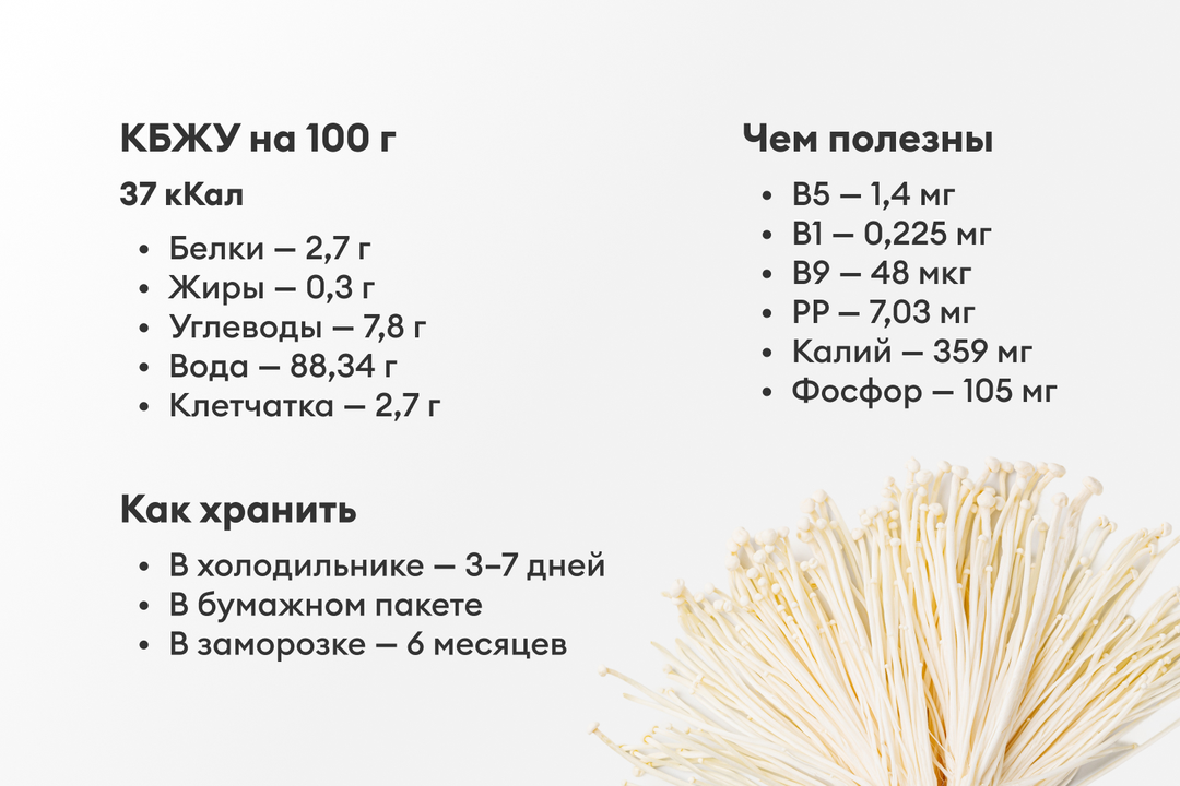 Эноки стоит не только попробовать, но и хорошо распробовать в различных видах и блюдах. С привычными грибами их сравнивать сложно, но в этом и кроется их прелесть. Собственный вкус эноки выражен не ярко, зато они отлично впитывают в себя ароматы сопутствующих ингредиентов, соусов и специй. А текстура, напоминающая упругую лапшу, делает блюда фактурнее и интереснее. Что можно приготовить с эноки? Да, пожалуй, всё что угодно. В сыром виде они отлично дополнят лёгкие салаты с руколой и черри. Грибы можно замариновать в соевом соусе, потушить с говядиной или обжарить с овощами. А ещё это отличный ингредиент для азиатских супов.