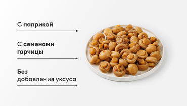 Упругие белые шампиньоны замаринованы с паприкой и душистыми семенами горчицы. В меру солёные, пряные, с нежным вкусом. Отличная закуска и аппетитный ингредиент салатов, супов и жаркого. Такие грибочки можно добавить в жюльен или в начинку для румяных пирогов. Масса основного продукта: 258 г