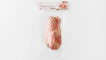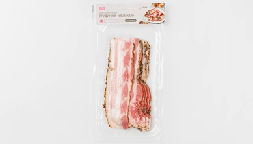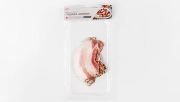 Варёно-копчёная свиная грудинка с выразительной ноткой специй. Нежная сама по себе, она буквально тает во рту за счёт тонкой нарезки. Прекрасна на бутербродах, в пицце, пасте и в составе мясной тарелки.