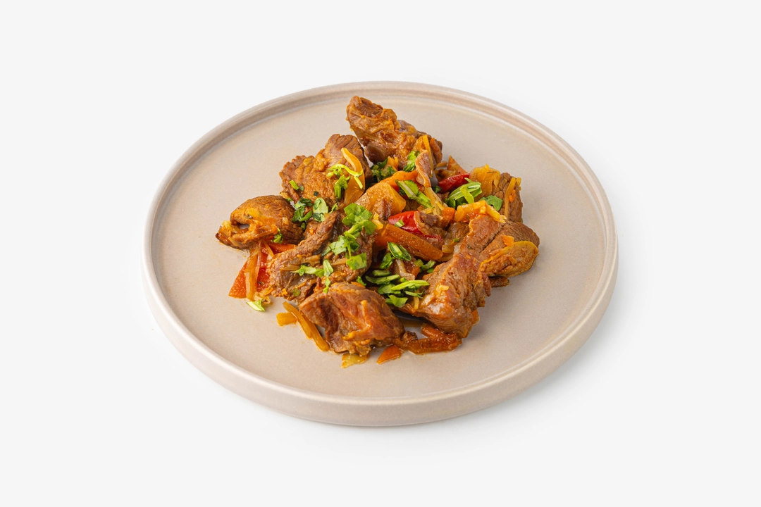 Кусочки говядины медленно тушатся до мягкости вместе с луком и томатной пастой, поэтому мясо становится сочным, пропитывается густым соусом с лёгкой кислинкой и без труда разделяется на волокна. Блюдо выглядит аппетитно: мясо в окружении мягких овощей и густой подливки. Такой гуляш можно подать с картофельным пюре, рисом или гречкой — он хорошо сочетается с любыми гарнирами и делает их вкус более насыщенным.
