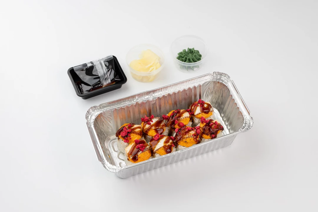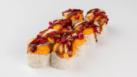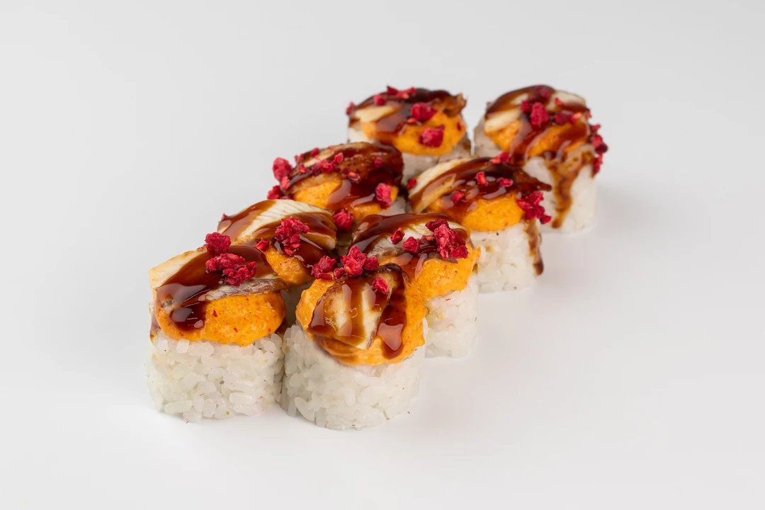 основа (рис для суши (крупа рисовая отварная (вода питьевая, крупа рисовая шлифованная), соус для риса (уксус рисовый (уксус рисовый, уксус спиртовой, вода питьевая, сахар, соль пищевая), сахар, соль пищевая), сыр творожный м.д.ж в сухом веществе 65% (творог (нормализованное пастеризованное молоко, бактериальная закваска, молокосвертывающий фермент микробного происхождения), загуститель- модифицированный крахмал, соль пищевая, стабилизаторы (камедь рожкового дерева, гуаровая камедь), регулятор кислотности - лимонная кислота, вода питьевая), огурец свежий), начинка (шапка)(соус спайси (майонез мдж 67% (масло подсолнечное и масло оливковое рафинированное дезодорированное, вода питьевая, сахар, яичный желток жидкий, соль пищевая, лимонный сок прямого отжима, уксус спиртовой 20 %, горчичное масло нерафинированное), соевый соус (вода питьевая, соевые бобы, пшеница, соль, сахар), перец красный молотый), майонез мдж 67% (масло подсолнечное и масло оливковое рафинированное дезодорированное, вода питьевая, сахар, яичный желток жидкий, соль пищевая, лимонный сок прямого отжима, уксус спиртовой 20 %, горчичное масло нерафинированное), сыр Пармезан м.д.ж. в сухом веществе 32% ( молоко нормализованное пастеризованное, бактериальная закваска мезофильных и термофильных молочнокислых организмов, соль поваренная пищевая, уплотнитель хлорид кальция, молокосвертывающий ферментный препарат животного происхождения), соус унаги (вода, сахар, соус соевый (вода, соя, пшеница, соль, мука пшеничная), загуститель модифицированный крахмал, краситель пищевой сахарный колер 1 простой, консервант сорбат калия), смесь специй "шичими" (перец красный, перец черный, апельсиновая цедра, кунжут, имбирь, морские водоросли), чеснок сушеный), жареное филе угря в соусе проложенное (угорь речной (продукция аквакультуры, произведено из мороженного сырья), соевый соус (вода, соя, соль), сахар, кукурузный сироп и крахмал), соус унаги (вода, сахар, соус соевый (вода, соя, пшеница, соль, мука пшеничная), загуститель модифицированный крахмал, краситель пищевой сахарный колер 1 простой, консервант сорбат калия), малина сублимированная (малина свежая), водоросли нори сушеные, соус соевый (вода питьевая, соевый соус (вода питьевая, соевые бобы, пшеница, соль, сахар), сахар), имбирь маринованный (корень имбиря свежий, уксус рисовый (уксус рисовый, уксус спиртовой, соль, сахар), соль, сахар), васаби (вода питьевая, васаби порошок (порошок хрена, горчичный порошок, крахмал кукурузный, соль пищевая, антиокислитель-аскорбиновая кислота), порошок спирулины). Продукция производится на предприятии, где используются рыба, моллюски, ракообразные, яйца, молоко, кунжут, сельдерей, орехи, злаки и продукты их переработки. Возможно попадание в продукт фрагментов костей рыбы.