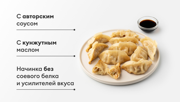 Дополнили гёзда авторским соусом и кунжутным маслом. Состав проверен: в начинке нет соевого белка и усилителей вкуса