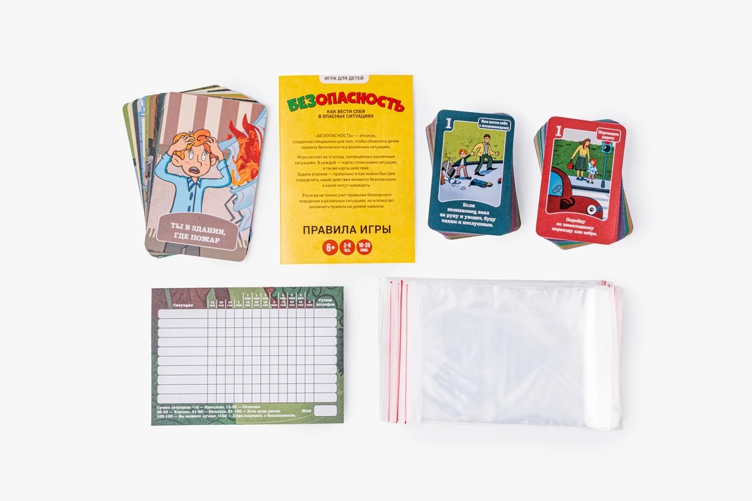 Обучающая игра знакомит детей с правилами безопасности в увлекательном игровом формате. 12 колод карточек охватывают разные ситуации, в которых нужно быстро выбрать правильную модель поведения. В результате ребёнок сразу получает практические сценарии с комментариями и пояснениями. Игра помогает отработать навыки до автоматизма, ведь важно не просто запомнить правила, а понять, как они работают. Блокнот для учёта результатов позволяет отслеживать прогресс и возвращаться к сложным темам. Все материалы хранятся в органайзере с игровым полем на обратной стороне.