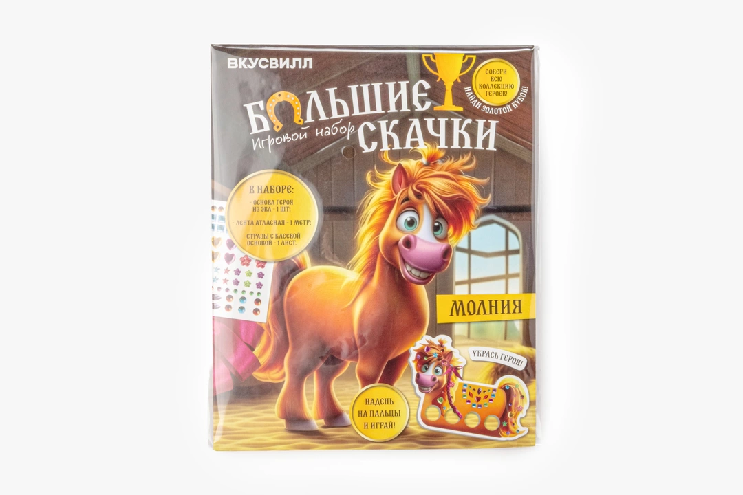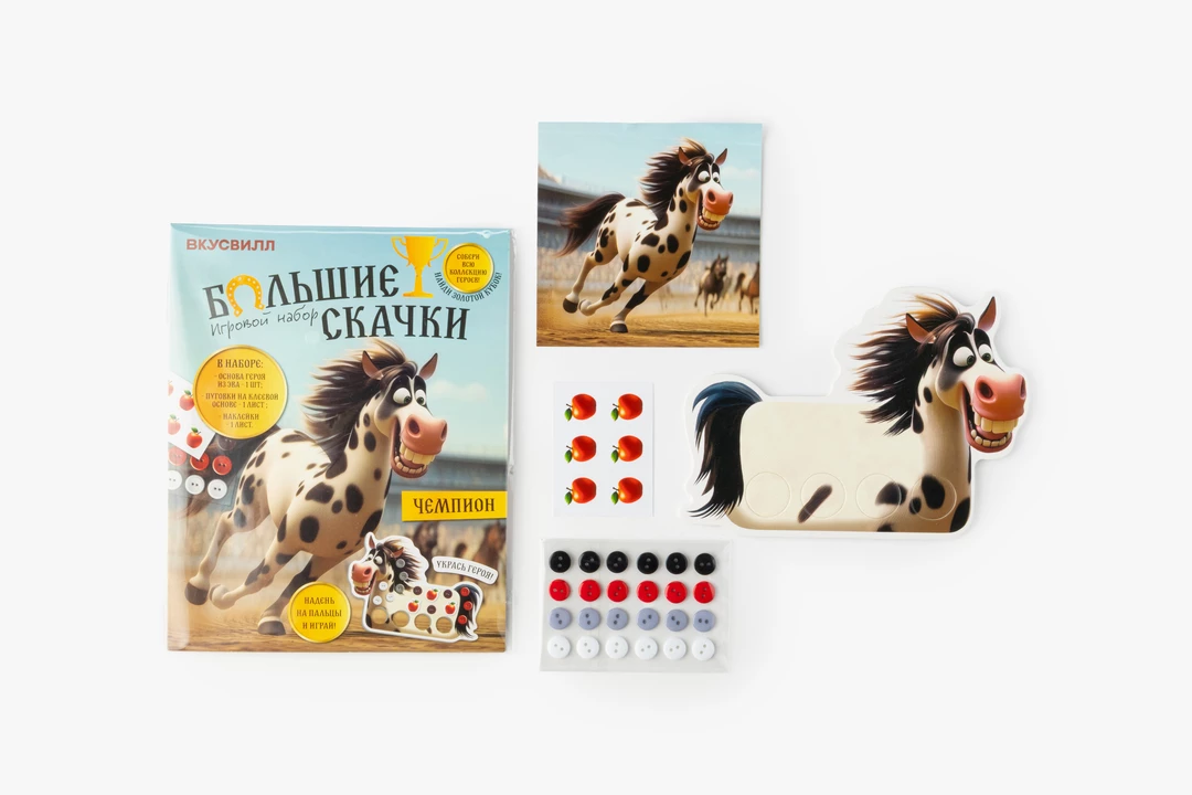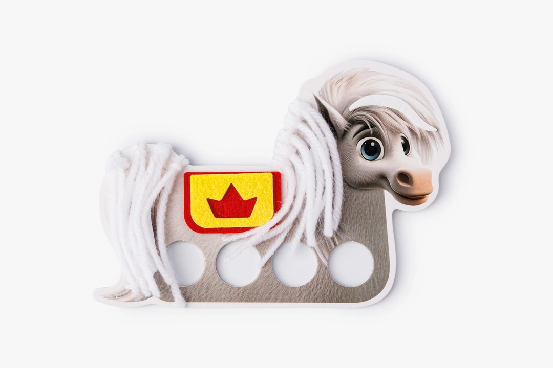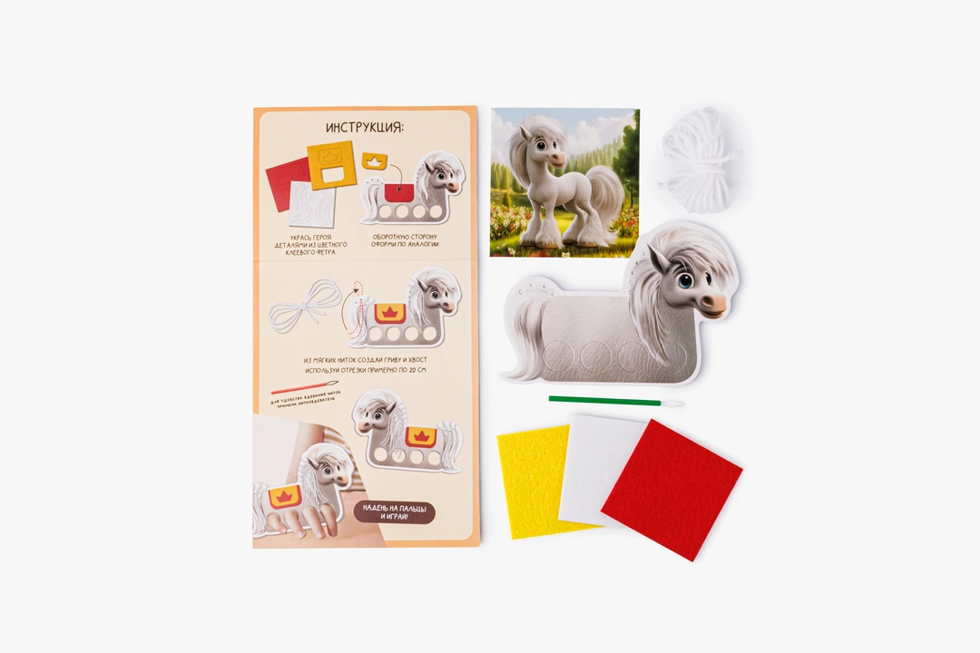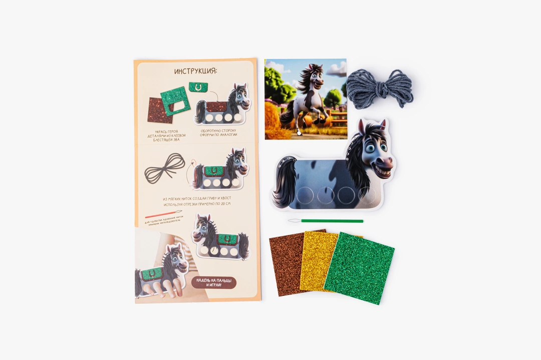 Этот набор предлагает малышам создать собственную лошадку для настоящих скачек. Симпатичного сказочного коня нужно украсить блестящими деталями, а затем сделать ему пушистые гриву и хвост из ниток. Готовая игрушка надевается на руку и оживает. Ребёнок развивает мелкую моторику, аккуратно прикрепляя декоративные элементы к картону. Такая игрушка станет героем домашних спектаклей и весёлых историй.