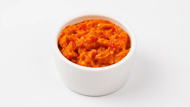 Пикантная закуска с густой консистенцией и насыщенным ароматом. Баклажаны в томатной пасте приобретают особенную мягкость, а сладкий перец и морковь добавляют свежие ноты. Острый красный перец даёт яркий акцент, но не перебивает вкус овощей. В составе только натуральные ингредиенты и нет сахара. Хорошо намазывается на хлеб или дополняет тёплые лепёшки. Можно подавать как соус к запечённому картофелю или использовать в качестве начинки для лаваша.