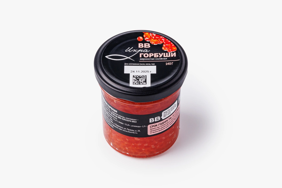 Икра горбуши с Дальнего Востока. В ней нет растительного масла и бензойной кислоты. Сохранить нежный продукт помогает сорбиновая кислота — природный консервант, который обладает антимикробными свойствами и не накапливается в организме. Икра от разных лососёвых рыб отличается по размеру, оттенку и вкусу. Икра горбуши в этом ряду — классика. Вкус у неё нежный, без резких рыбных нот и горчинки. Диаметр икринок средний, примерно 4–5 мм. Оболочка тонкая и легко лопается, образуя икорный сок. Цвет варьирует от бледно- до ярко-оранжевого. Отлично подходит для тарталеток, бутербродов, блинов и декора закусок.