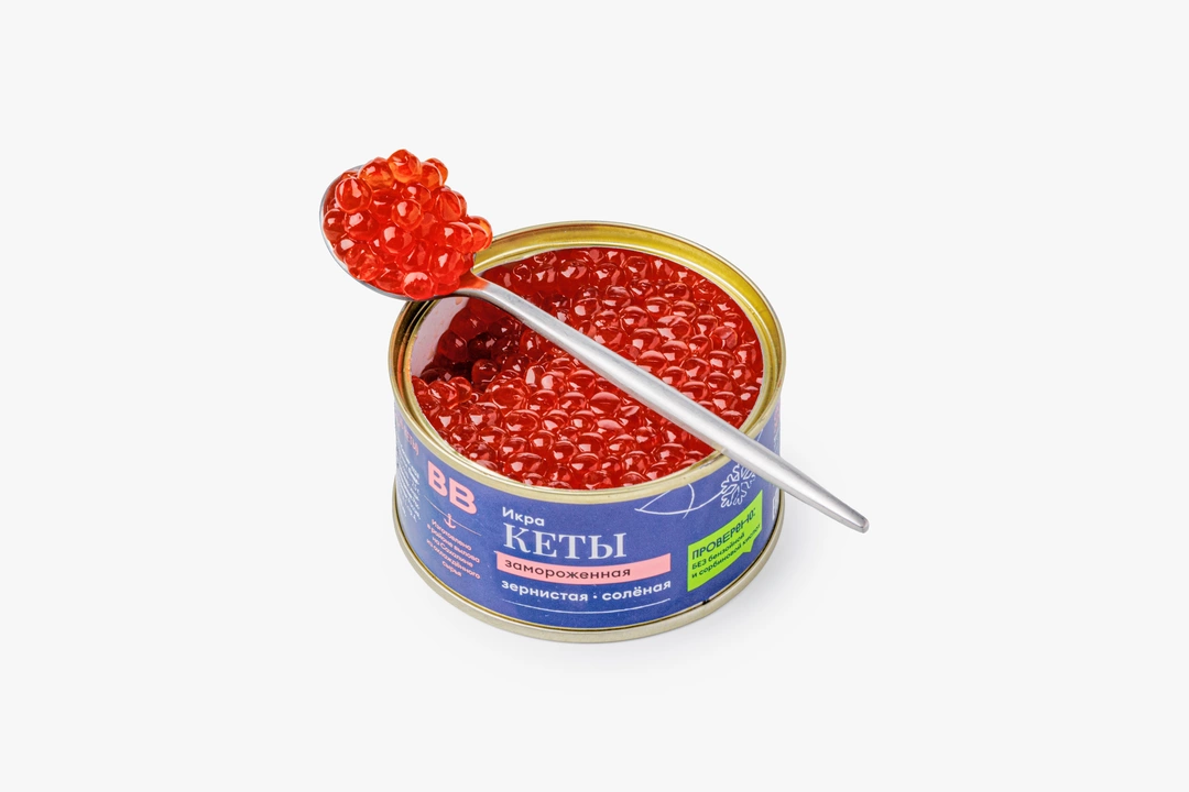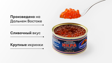 У нашей икры кеты нежный, слабосолёный и сливочный вкус, за что её называют царской. Добыта на Дальнем Востоке и изготовлена на берегу в зоне вылова. В составе, помимо самой икры, только небольшое количество соли и растительное масло. Не содержит бензойной кислоты и консервантов