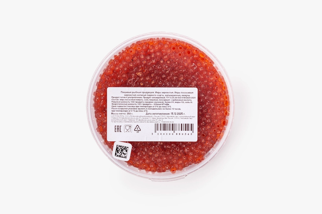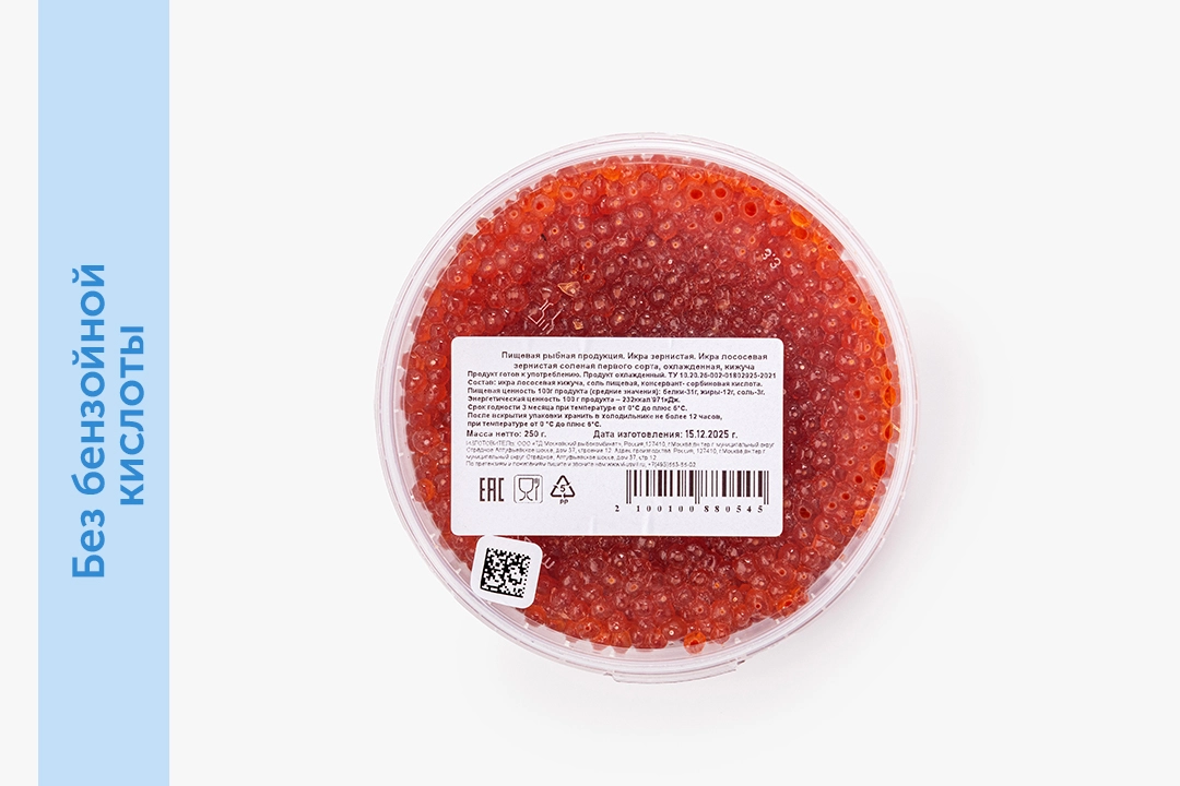 Деликатесный продукт из охлаждённой икры кижуча. Мы не используем растительное масло и бензойную кислоту, свежесть продукта сохраняет сорбиновая кислота — природный консервант, который не накапливается в организме. Крупные икринки имеют яркий цвет и слегка горчат, что характерно для этого вида рыбы. Икра подходит для приготовления бутербродов на свежем хлебе, заправки блинов и наполнения тарталеток. Блюда с икрой станут изюминкой праздничного стола и украшением любого меню.