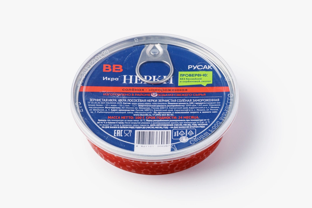 Зернистая икра нерки без консервантов. Имеет выраженный маслянисто-солоноватый вкус с приятной лёгкой горчинкой. Икринки небольшие, насыщенного тёмно-красного цвета. Идеальна для бутербродов, тарталеток и декора блюд. Сохранить продукт помогает шоковая заморозка. Переложите баночку из морозилки в холодильник — и через 4–5 часов можно готовить гурманские закуски.