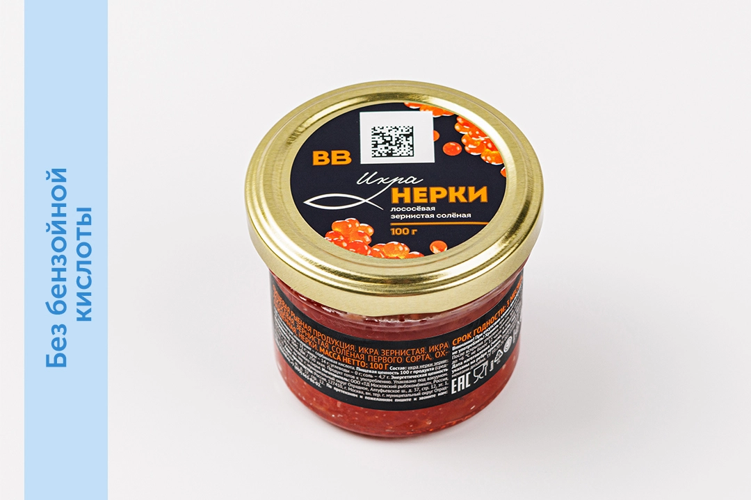Икра свежевыловленной нерки. Насыщенно-красная, солоноватая, с приятной горчинкой. Достаточно мелкие икринки эстетично смотрятся на бутербродах и могут украсить любые закуски. Соли в составе немного: она подчёркивает лучшие черты деликатеса и не перебивает натуральный вкус. Мы не используем бензойную кислоту. Сохранить нежный продукт помогает природный консервант — сорбиновая кислота, которая обладает антимикробными свойствами и не накапливается в организме.