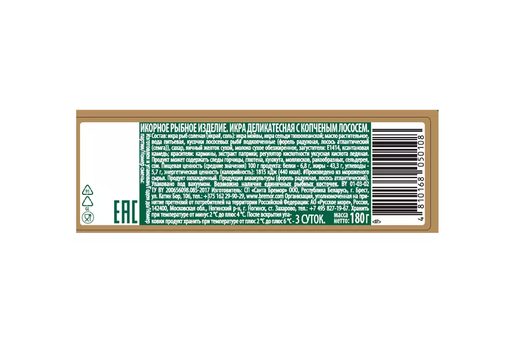 Икра Деликатесная – это натуральная зернистая икра мойвы и сельди в нежном соусе с кусочками копченого лосося. Изготавливается без использования консервантов и усилителей вкуса. Строгий контроль качества и тщательный отбор рыбного сырья позволяет сохранить стабильные вкус и качества продукта на протяжении всего срока годности Икра №1 - идеальный завтрак с поджаренными тостами или свежим багетом и любимыми утренними горячими напитками. Страна-производитель Республика Беларусь