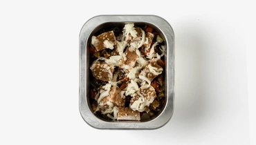 Индейка, приготовленная по технологии су-вид, получается особенно нежной и сочной. Здесь она сочетается с запечёнными овощами — морковью, кабачками, фасолью и сладким перцем. Соево-кунжутный соус придаёт блюду восточный акцент и лёгкую пикантность, а тёртая моцарелла делает текстуру более мягкой. Перед подачей блюдо нужно доготовить — запекать в духовке 12 минут прямо в упаковке.