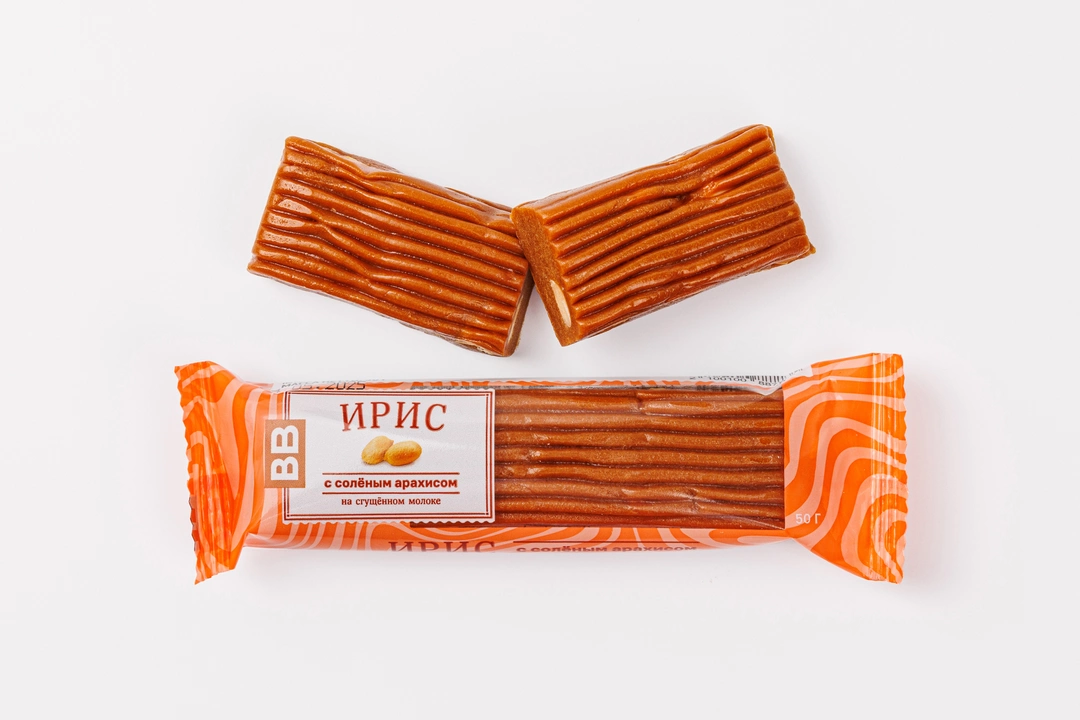Мягкий, пластичный ирис с карамельным вкусом, в котором ощущаются сливочные нотки и тонкая солоноватость. Соль здесь едва уловима — она лишь подчёркивает вкус. Арахис добавлен кусочками — не слишком много, но ровно столько, чтобы разнообразить текстуру и слегка оттенить сладость. Ирис легко откусывается, не липнет к зубам и приятно жуётся, постепенно раскрывая вкус сгущёнки и сливочного масла. Подходит для тех, кто любит традиционные сладости в немного обновлённом варианте. Удобный формат — можно разделить на кусочки, а можно сразу съесть целиком.