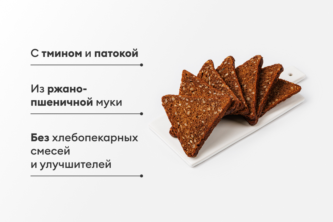 Ароматный пшенично-ржаной хлеб, выпеченный с добавлением патоки, ржаного солода и тмина. У него благородный вкус с маслянисто-злаковыми нотками и деликатными сладковатыми оттенками. Хлеб прекрасно подойдёт для воплощения любой кулинарной задумки: будь то просто подача с основным блюдом, приготовление бутербродов, гренков и горячих тостов.
